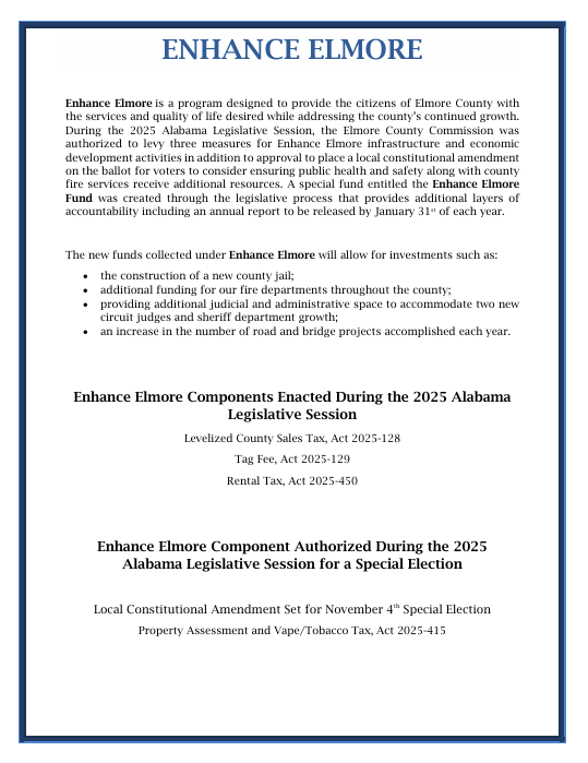 A program designed to provide the citizens of Elmore County the services and quality of life desired while addressing the County's continued growth.