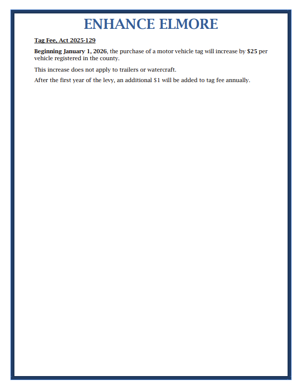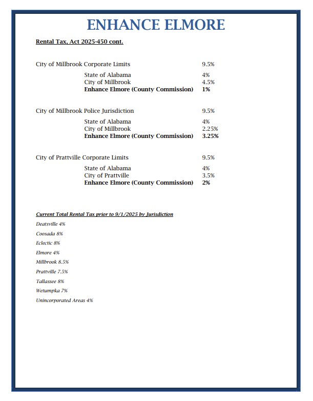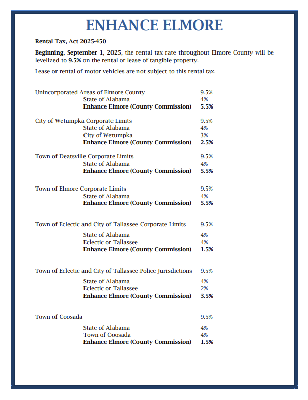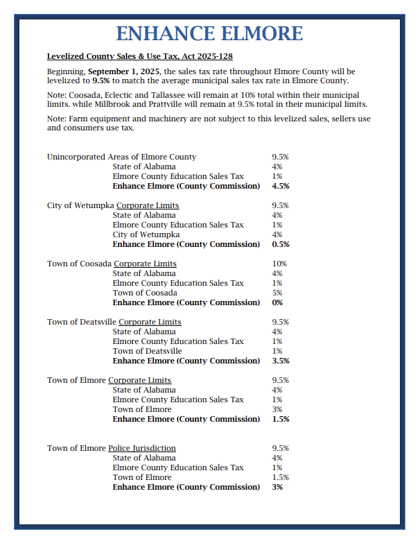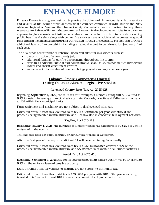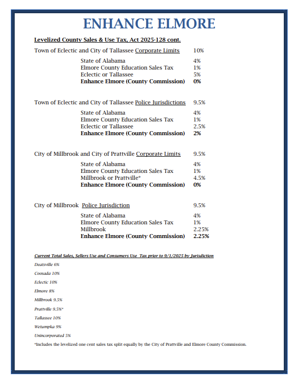 6. Over the last few years, the Alabama legislature has lowered grocery sales tax by 2% along with eliminating sales tax on baby items and feminine hygiene products. The Enhance Elmore levelized sales tax includes these exclusions.